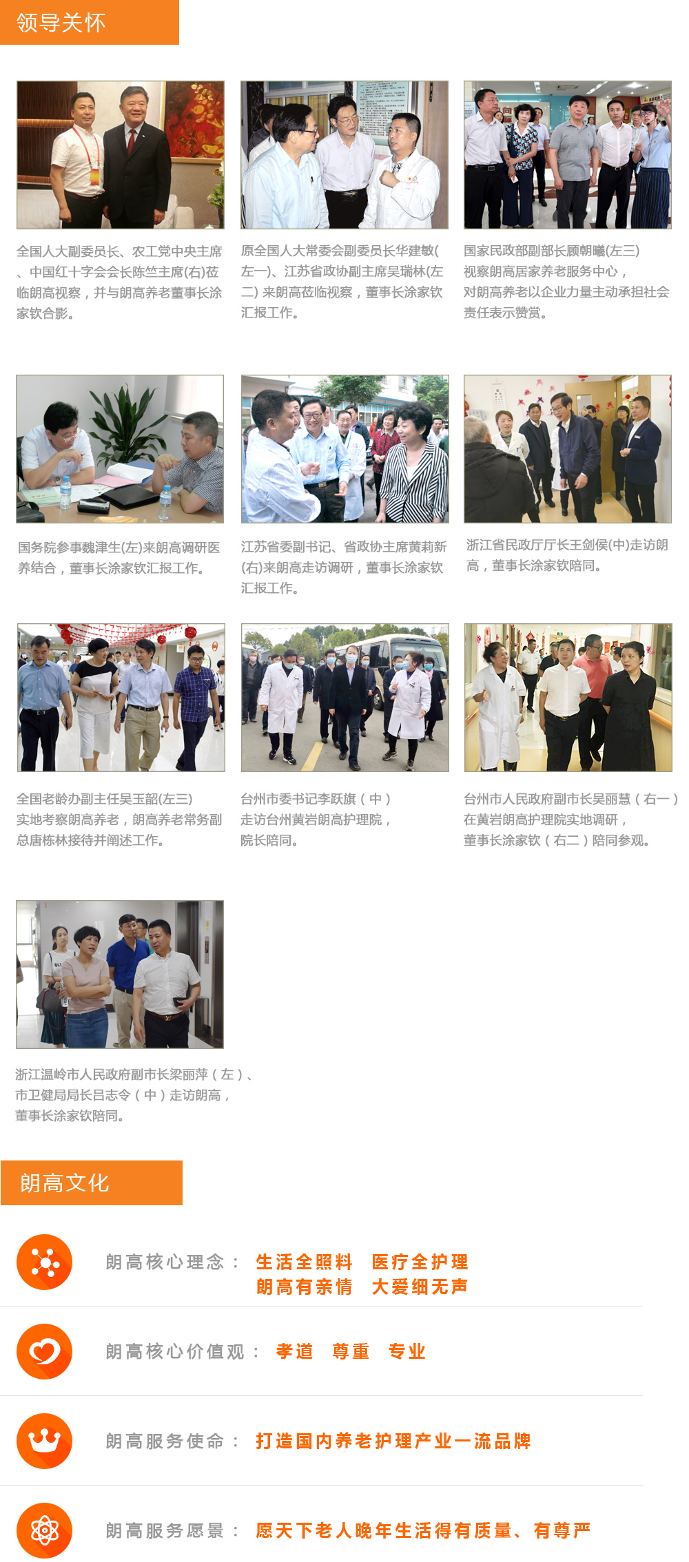 集团秉承“朗高有亲情,大爱细无声”的核心理念,以市场化、规模化、连锁化、品牌化为发展战略,致力于打造集生活照料、医疗护理、精神慰藉于一体的综合养老服务平台;目前旗下拥有16家下属子公司,运营10家养老机构(无锡朗高护理院、无锡市滨湖区朗高养老院、无锡梅园护理院、无锡市滨湖区蠡园朗高养老院、台州黄岩朗高护理院、台州市黄岩区朗高养老院、湖州朗高护理院、湖州朗高养老院、温岭朗高泽国护理院、台州路桥朗高护理院、温岭朗高医养护理院、黄岩区残疾人康复和托养中心、黄岩朗高康复护理院、椒江朗高康复护理院、泰州朗高医养护理院、泰州朗高养老院),并承接社区居家养老服务中心的养老服务,形成了机构养老、社区养老、居家养老多层次医养结合的业务布局,通过专业化亲情团队与个性化服务,让每位老人在尊老助老的“家”氛围中得到标准化、精细化的照护,实现身有所养、病有所医、心有所乐,以自身实践推动现代中国养老产业的发展。